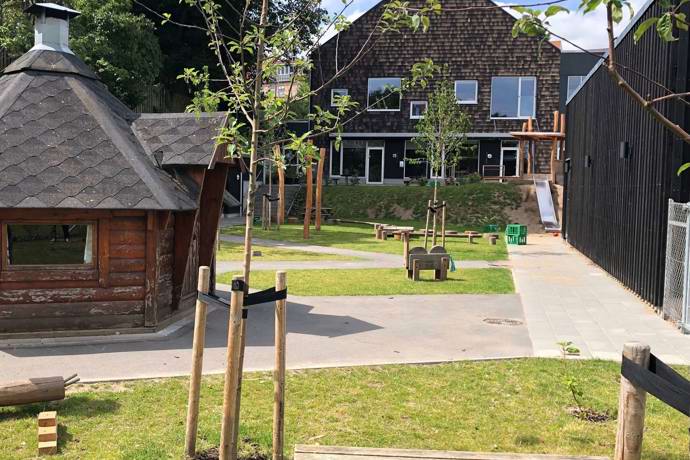 Vi er i gang med at udvikle vores legeplads, samtidig med at vi benytter os af byens forskellige legepladser og kulturtilbud, særligt Børnenes Jord, som ligger tæt på. Vuggestuen benytter flittigt vores ladcykler, når vi vil lidt længere væk - børnehavebørnene gerne tager bussen